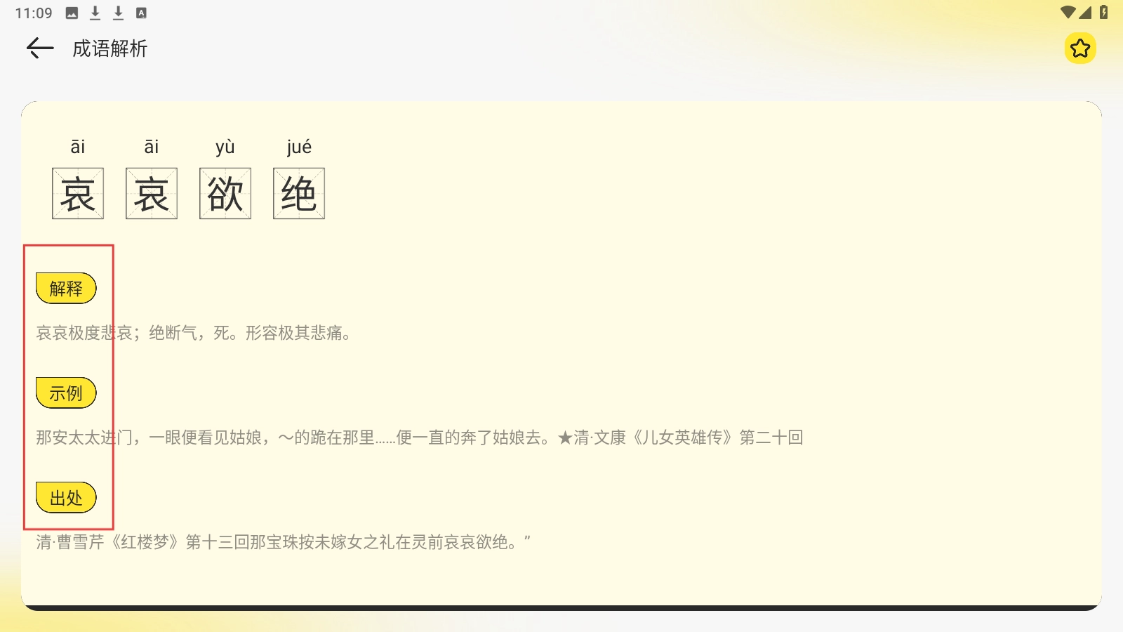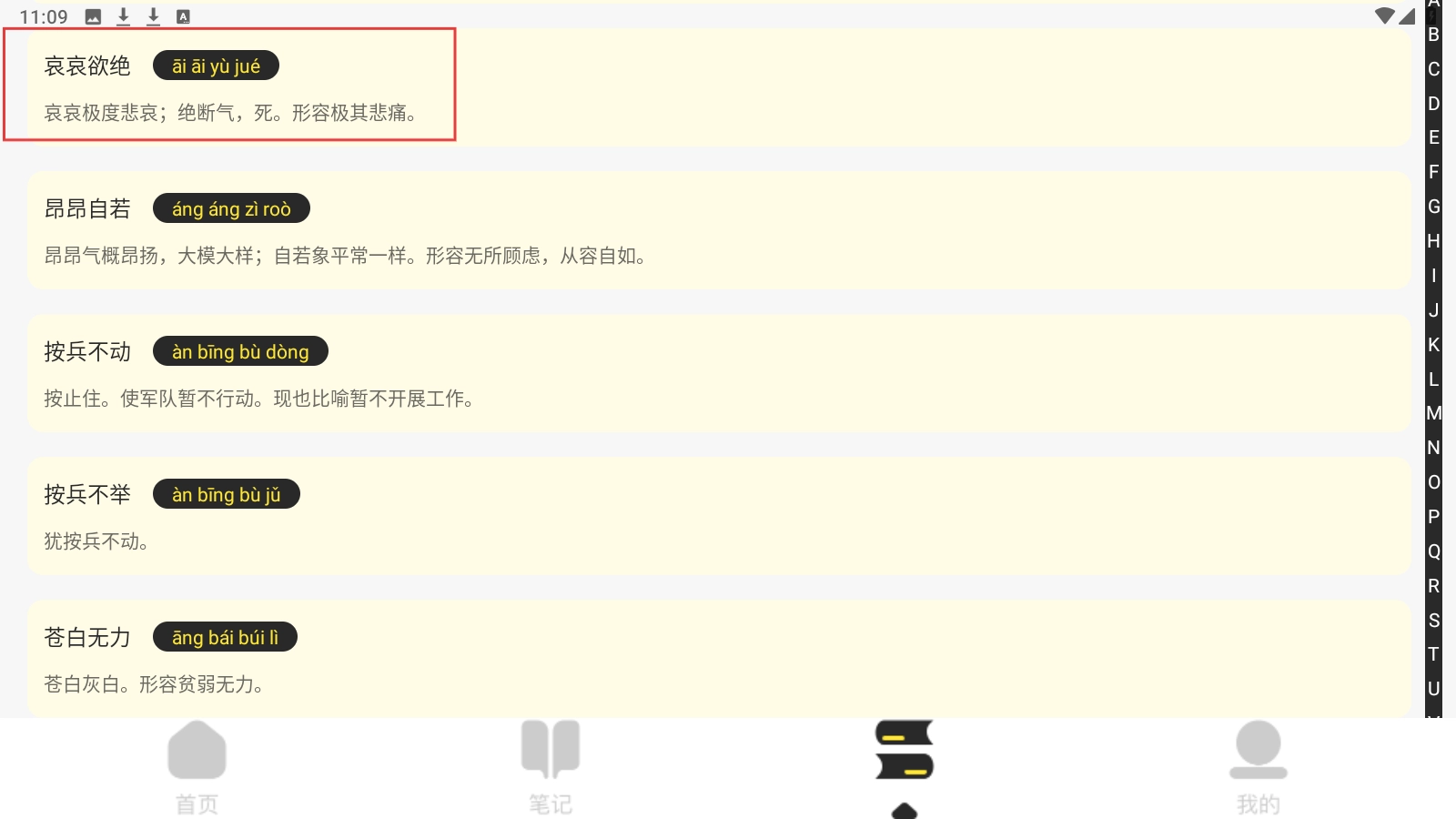 2、在成语列表页,点选成语如【哀哀欲绝】,可查看其读音与释义。