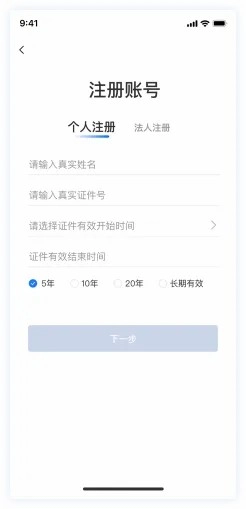 第二步:输入姓名、身份证号,根据身份证反面信息选择证件有效开始时间和身份证使用年限,点击“下一步”。