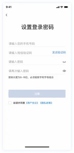 第三步:填入手机号,接着点击“发送验证码”,随后输入接收到的验证码。之后设置登录密码,并再次输入该密码予以确认,同时勾选用户协议与隐私政策,最后点击“注册”,如此便完成注册流程。