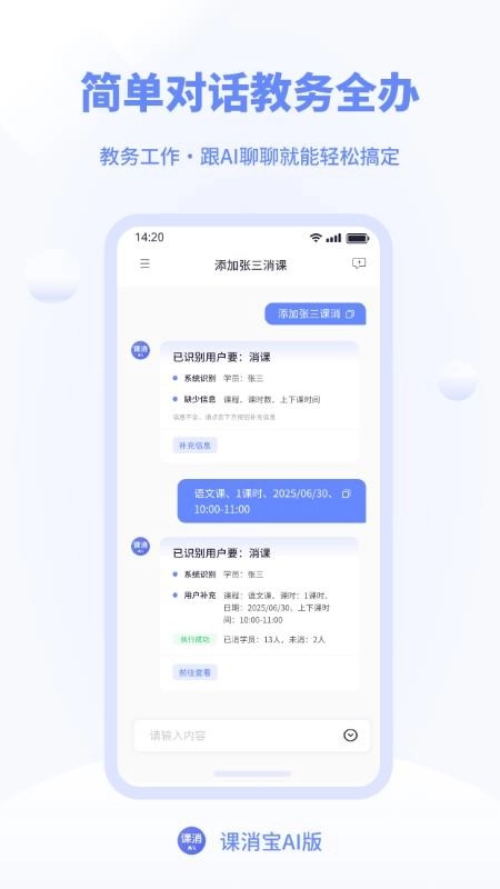 课消宝AI版旨在助力培训机构轻松达成教学管理目标。借助它,众多教务工作只需通过简单对话就能完成,实现一站式管理模式,更优地达成全平台互联。针对学员课程,能够灵活设置,还能智能排课与约课,如此一来,可轻松管理课时,随时把控学员的课时状况,进而实现更精准的分析与预警。