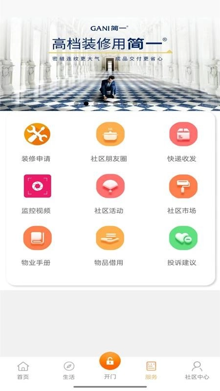 5、进入服务板块,看到诸多便民服务,可一键申请装修和查看视频监控等;