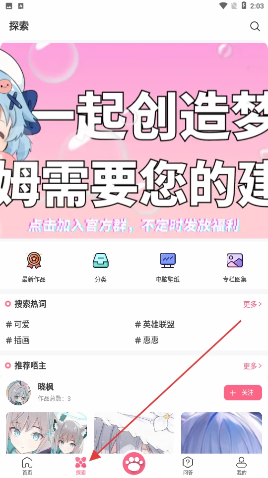 1、在唔姆壁纸底部点【探索】可进入探索页面,浏览最新作品、分类等内容。