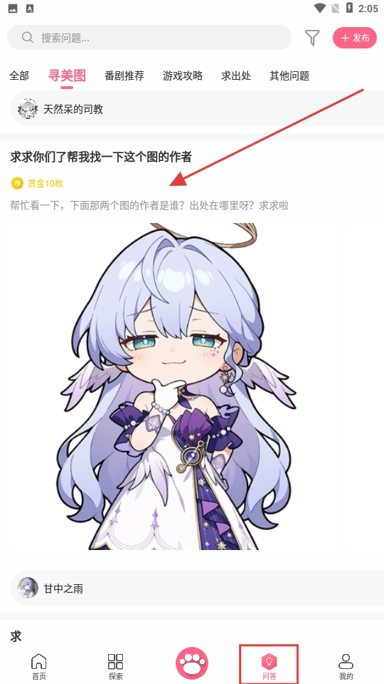 4、点底部【问答】可进入问答页面,参与寻美图等话题讨论,如找图片作者。