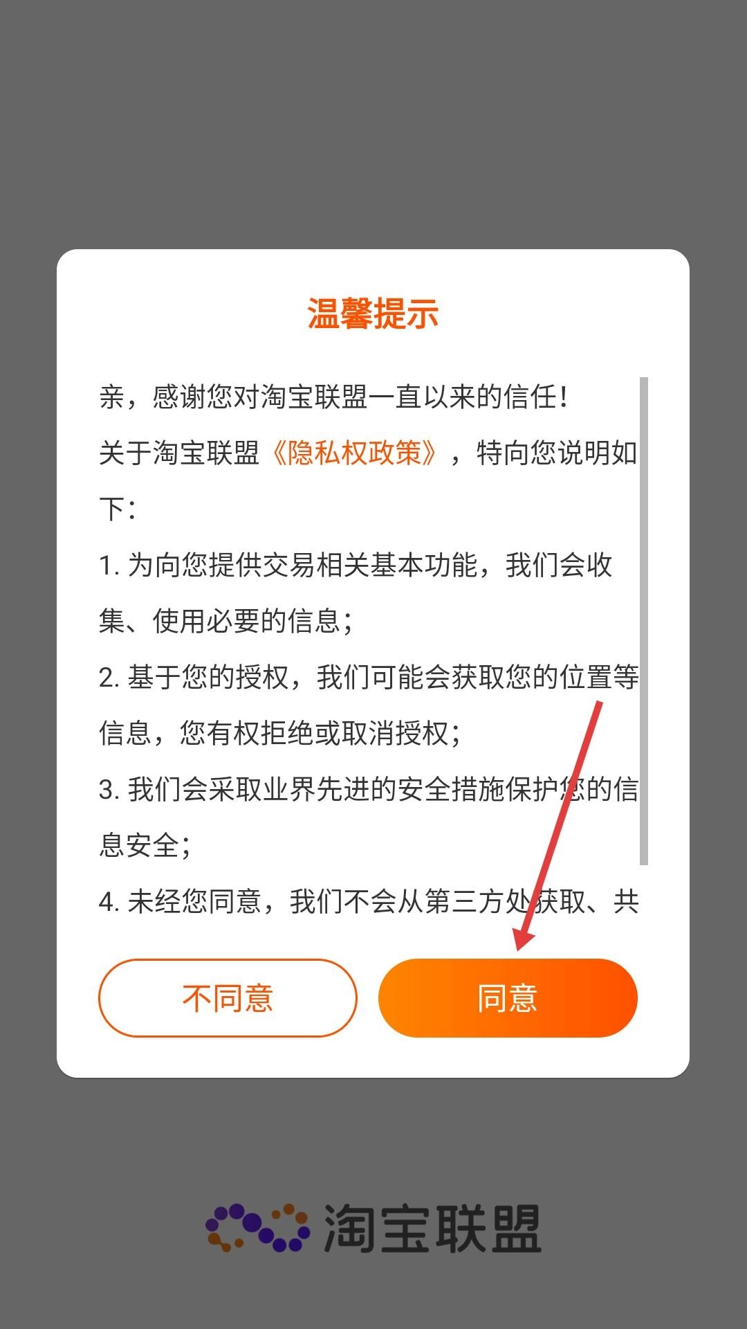 2、在弹出的提示窗口点击同意,页面将跳转到登录界面。在此界面勾选相关协议,选择“立即登录”,若使用淘宝快捷登录方式,则输入账号密码,即可开启联盟服务。