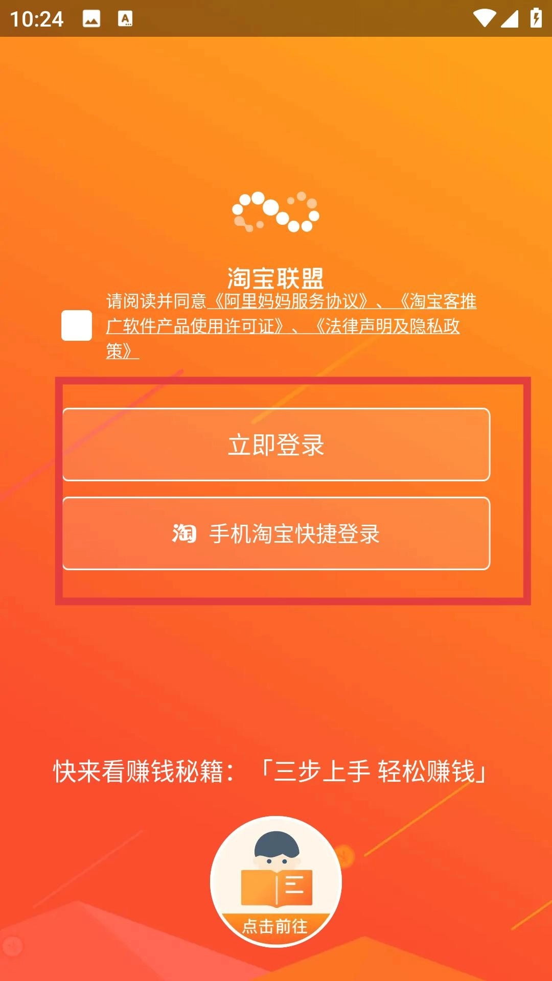 1. 开启淘宝联盟,点击同意提示,进入登录页面,选择立即登录,采用快捷登录方式,输入账号密码,完成登录后即可享受推广服务。