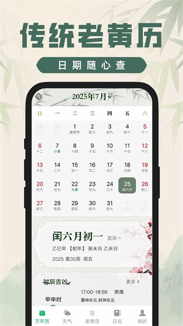 【清晰老黄历】呈现传统农历、干支纪日以及宜忌事项,清晰直观,便于查阅。