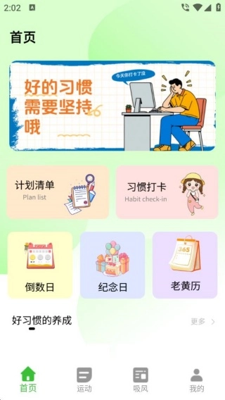 1. 安装软件并打开,进入平台首页,这里提供计划清单、习惯打卡、倒数日、纪念日、老黄历等内容。