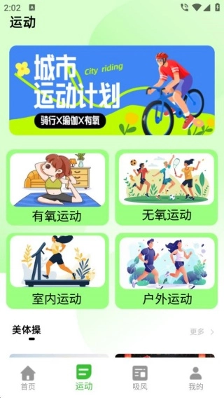 3、运动界面涵盖有氧运动、无氧运动、室内运动、户外运动以及美体操等项目,方便大家高效了解。