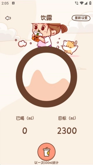 4、来到吸风饮露界面,你能够详细记录自身的体重,选择相应的运动情况,进而生成每日所需的喝水目标。