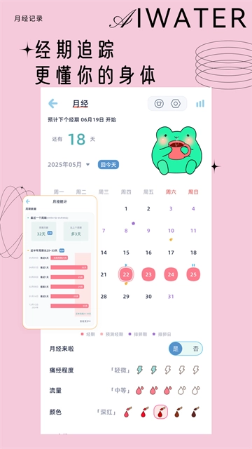 (1)清新简洁的月经周期日历,轻松翻阅历史记录和预测经期;