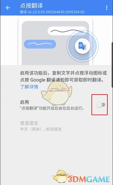 4、进入点按翻译页面找到“启用”,点击右侧的按钮即可开启(如图所示)。