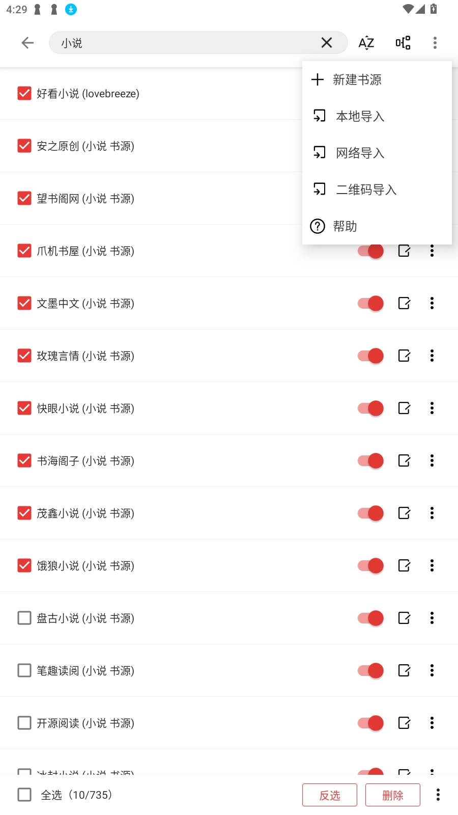 5、或者点击右上角三点,还支持网络导入,本地导入,二维码导入,新建书源等。