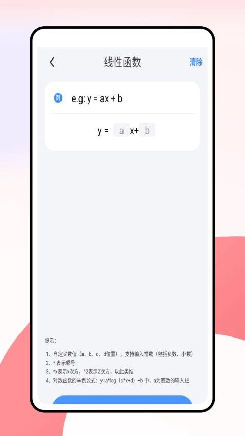 2、在线性函数页面,可查看线性函数示例公式y=ax+b,并能输入相关参数。