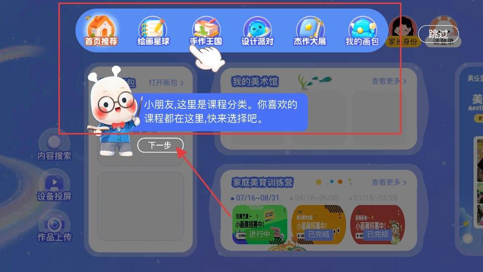 1. 挑选合适课程:开启软件后,依据孩子的年龄以及学习需求,在美术基础课程和扫盲早教课程中做出选择。通过在线AI课程里的动画故事来启动学习,依照专业的内容循序渐进地掌握美术知识与技能。