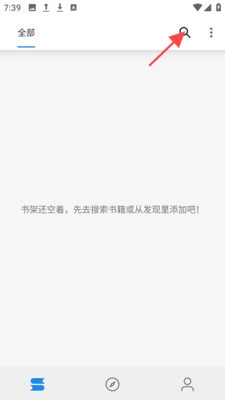 1、安装后,进入【书架】界面,点击右上角“搜索”图标。