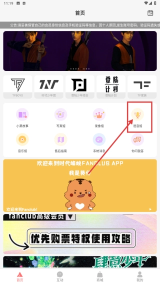 1、打开时代峰峻FANCLUB-,在首页点击语音馆图标,进入语音馆选择页。