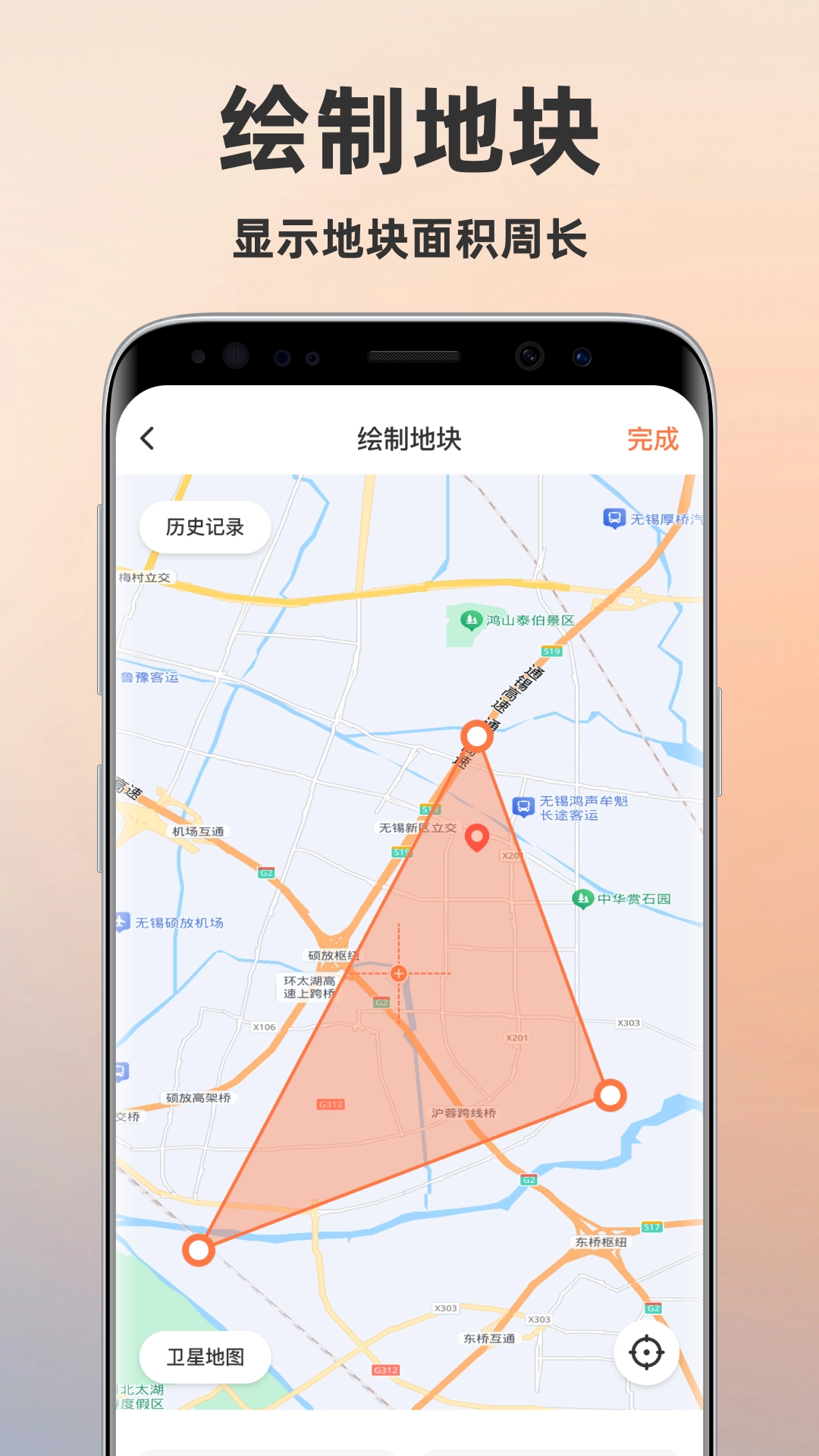 您只需在此处输入地块的面积与周长,地块形状便会在高德地图上呈现出来。