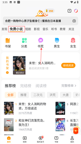 1、打开悟空浏览器,在首页点击【免费小说】,进入【书荒】列表;