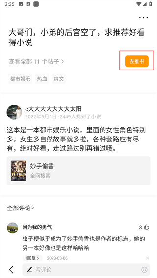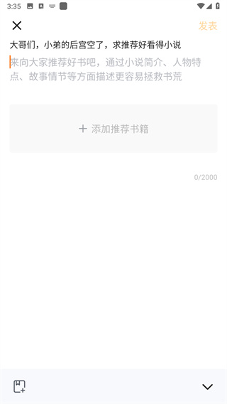 4、在作品简介、人物特色、故事情节等方面进行描述填写,点击想要添加的书籍,随后发表即可。