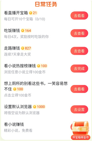 4、日常任务包含:观看直播并开启宝箱、通过吃饭获取收益、走路赚取收入、查看小说热搜榜来赚钱、设置默认浏览器,以及阅读小说赚钱。