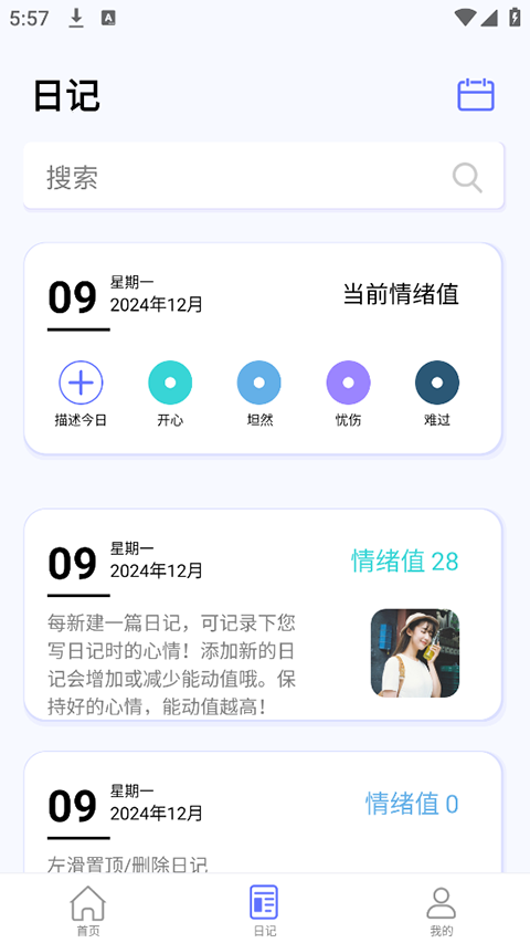 【心情报表】用户写日记时可以很方便地选择自己的心情(如:开心、坦然、忧伤等),APP会根据用户日记心情生成对应的情绪值,同时根据用户近期日记在首页生成一个情绪报表,并提供合适的建议.