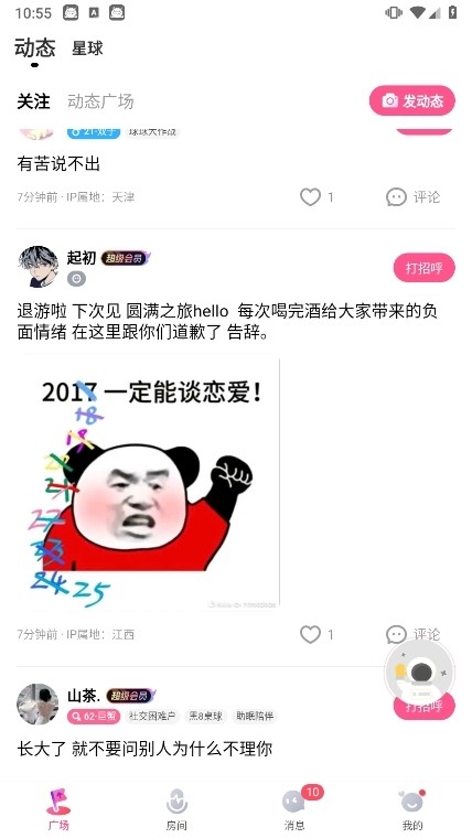 在广场页面浏览动态与星球,还可进入房间开展交友扩列、蒙面交友、寻找附近的人、查看推荐、参与电台直播、进行相亲交友以及好声音等活动。