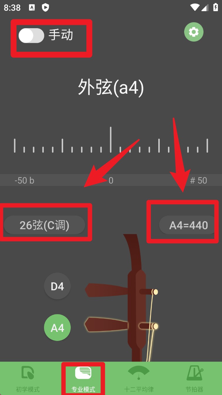 2. 如果您需要更高的精度或者想要进行手动操作,点击底部的“专业模式”,就能进入精准调音界面。在该界面的左上角,可以切换“自动/手动”模式,界面中间的指针会显示音准偏差情况。
