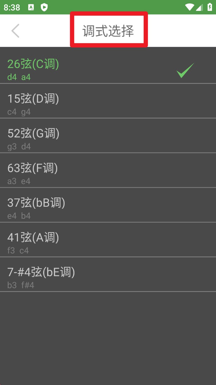 3. 轻点左下角的调弦名(例如26弦C调),便能自主挑选不同调式,像D调、G调、bB调等等,满足多种民族乐器的演奏需求。