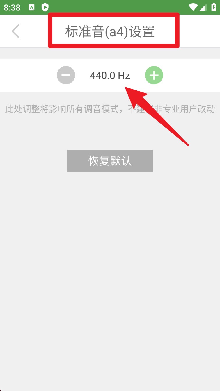 4. 若要调整标准音高,可前往设置里的“标准音设置”,利用“+”或“-”对A4频率(默认440Hz)进行调节,以实现更专业的频率校正。