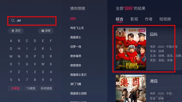 1、首先你需要点击上方的【搜索】,然后搜索关键词“JM”然后在右边的搜索结果中选择“影视”类别,你就可以看到囧妈。
