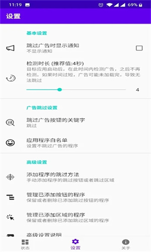 程序会查找所有含有这个关键字的控件,然后自动点击控件,帮用户跳过广告。如果目标应用使用的不是这些关键字,您可以在“设置”里增加新的关键字。