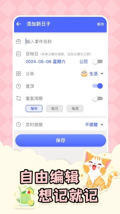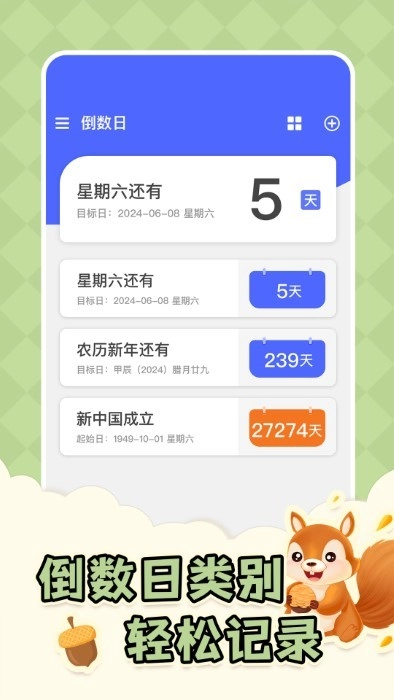 5、事件/任务/项目倒计时:重要事项的截止日期绝不容错过,纪念日提醒功能会及时向你发出提醒。