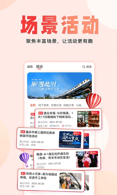 厢遇平台,专为重庆本地打造的交友圈子软件。在这里,你能真切感受相遇场景,圈子成员皆来自本地。大家可直接在圈子里互动,若遇到心仪对象,就能直接相约,助你成功脱单。而且,这是由媒体精心打造的平台,通过聊天互动,你能拥有更多选择。快来这里瞧瞧吧!