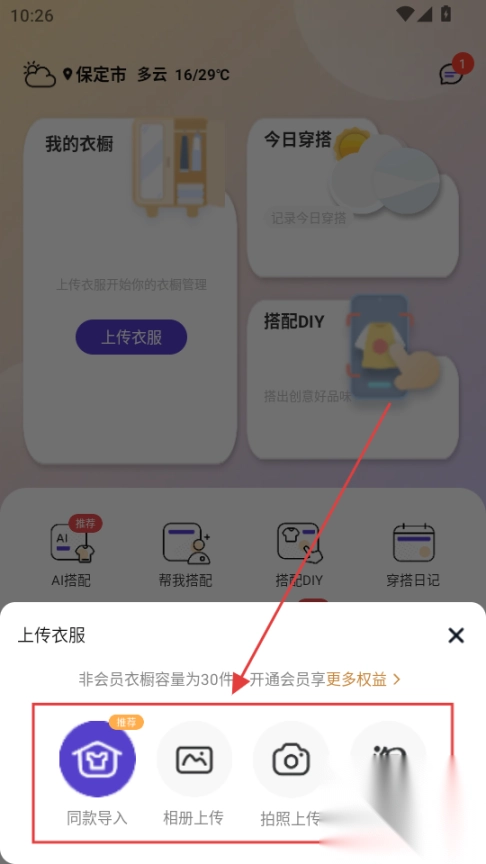 操作便捷性:首页悬浮录入键一键上传衣物,支持淘宝详情图直接导入,降低使用门槛。