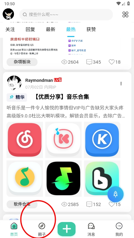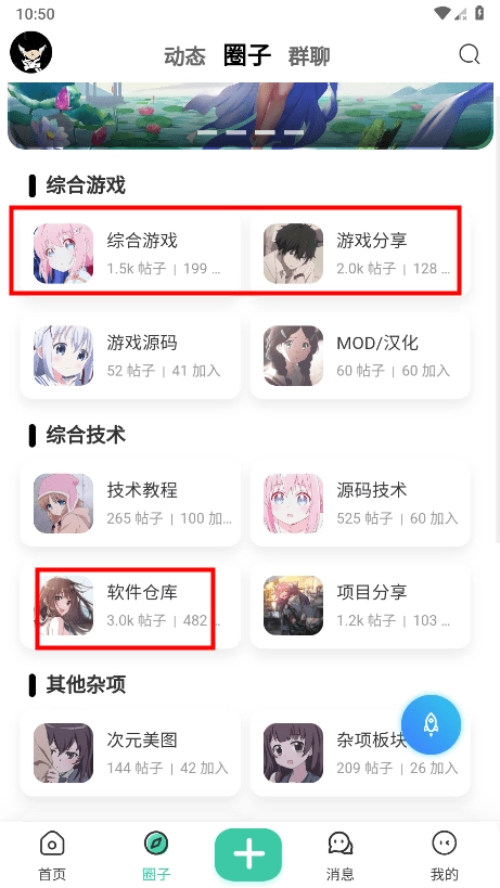 2、在圈内,能看到综合游戏、游戏分享、软件仓库这三个板块,从中找到您所需的内容。