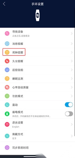 2. 在弹出的【手环设置】页面里,点击【闹钟提醒】按钮,即可着手设置时间。