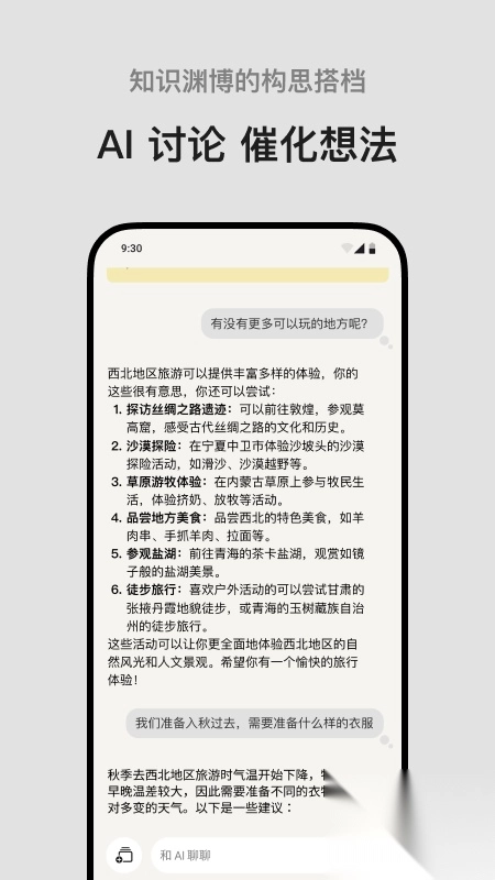 6、用户可与AI探讨自身的想法与思路,借助智能算法实现智能拓展,还能依据自身想法生成所需内容。