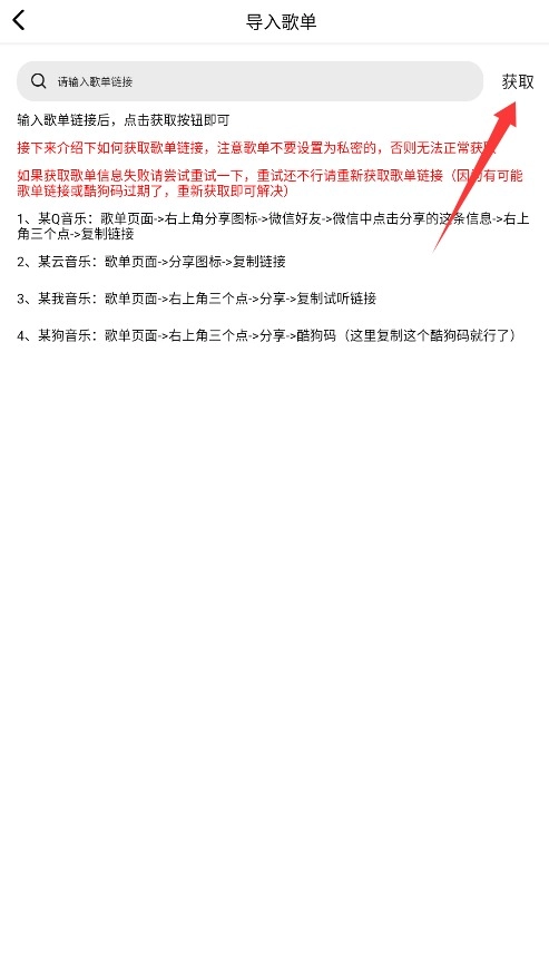 2、在输入框粘贴其他音乐平台的歌单分享链接,点击"获取"按钮解析歌单内容。