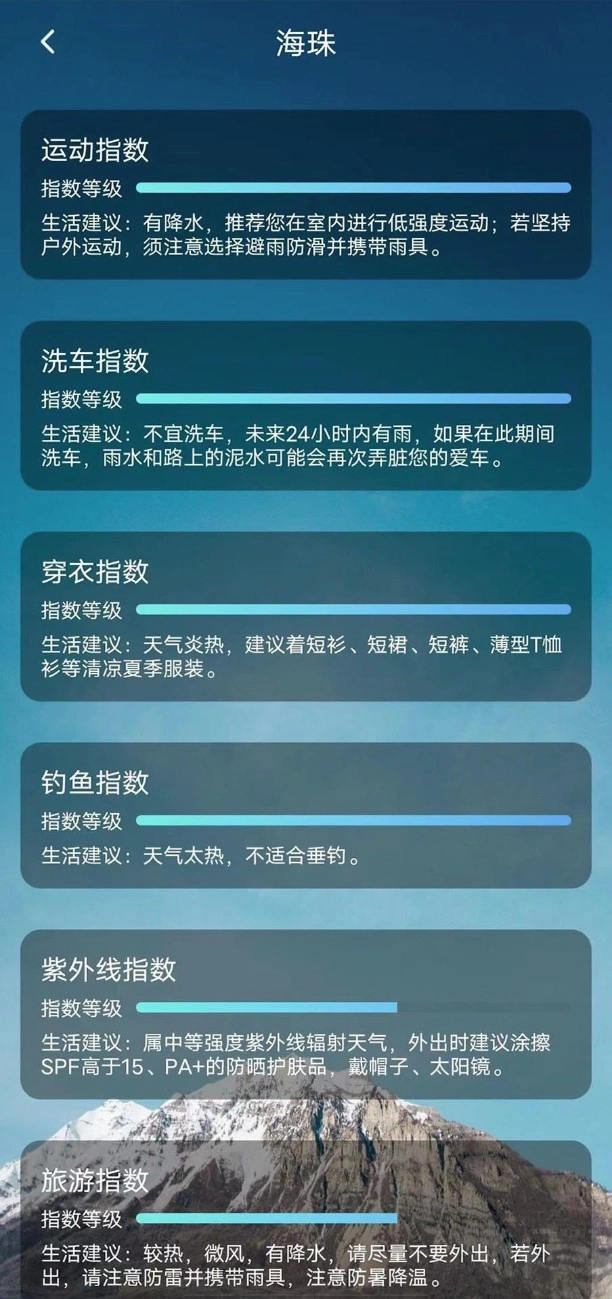 4、生活指数推荐:出行、穿衣、洗车、过敏等生活建议一键查看。