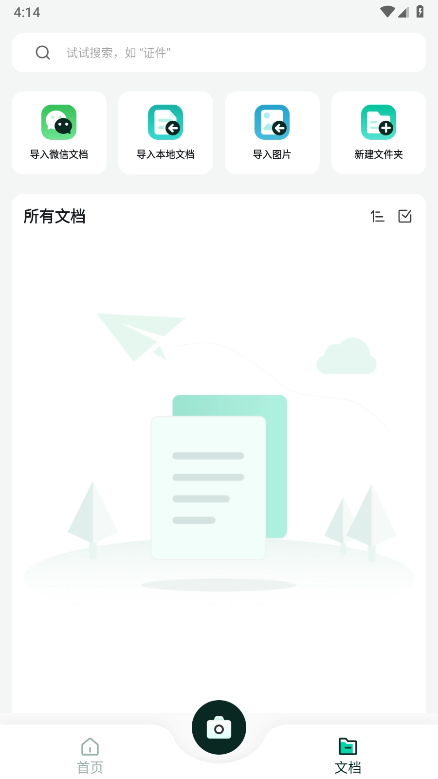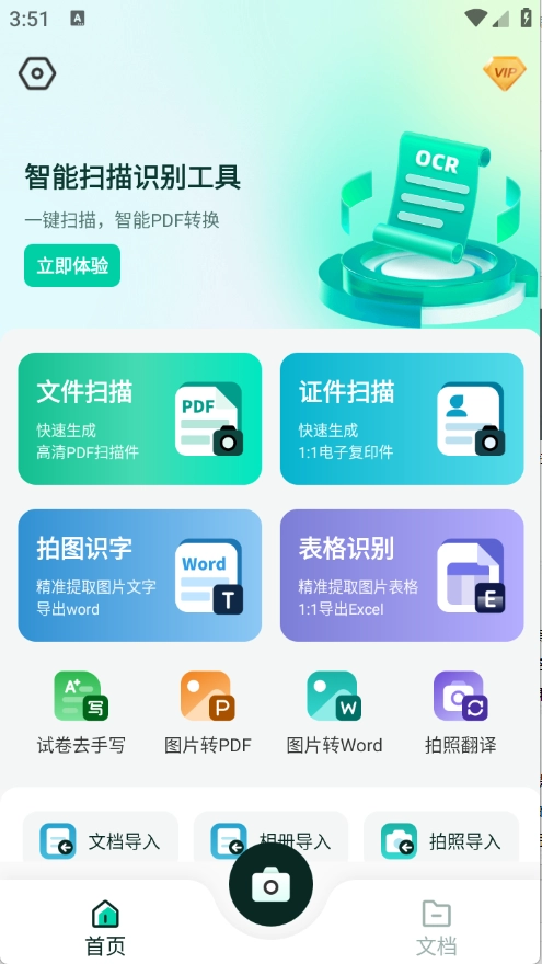 2. 首页集合了众多扫描识别功能,涵盖文件扫描、证件扫描以及拍图识字等。