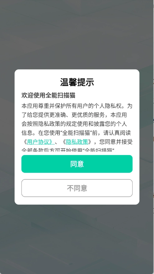 1. 开启全能扫描猫App,仔细查看隐私政策与用户协议后予以同意。