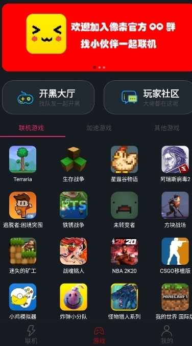 1、第一步,打开像素联机软件。在软件的首页,能看到诸多类型的游戏,像联机游戏、加速游戏以及其他各类游戏等。随后,进入玩家社区。