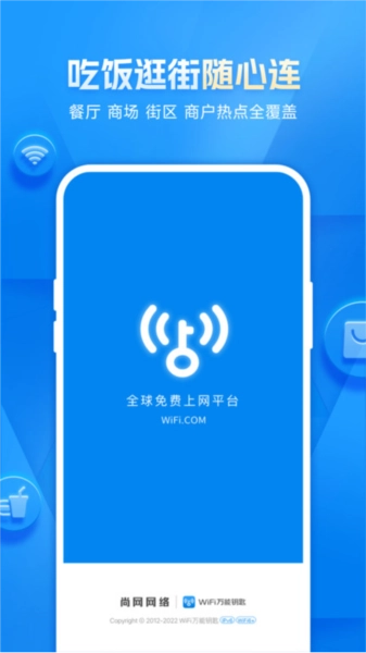 3, 一键连网: 一键连接WiFi万能钥匙网络,时刻保持在线,不限时不限速,省心省力。