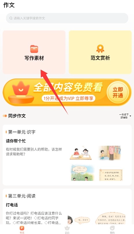 2、智能检索应用:输入"春天""我的妈妈"等关键词,可快速获取相关范文、好段及写作方法指导。