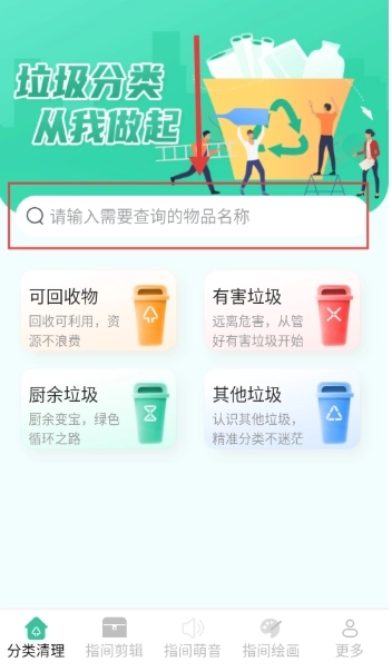 2、在主界面,可通过【搜索框】查找物品,也能选择【可回收物 - 有害垃圾 - 厨余垃圾 - 其他垃圾】模块进行分类。
