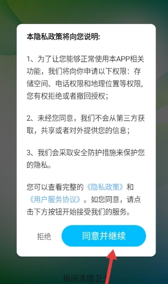 1. 阅读《隐私政策》与《用户服务协议》,点击【同意并继续】,进而进入指间清理卫士。