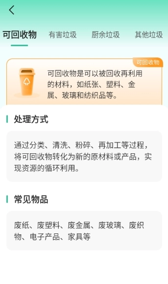 3、点开【可回收物】详情页面,研习【处理方式-常见物品】板块内容,从而掌握垃圾分类相关知识。
