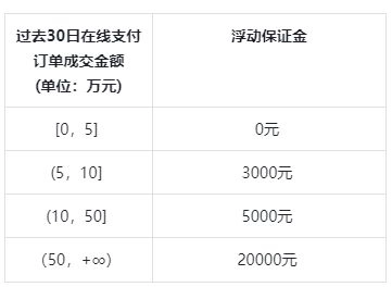 浮动保证金的金额取决于店铺上月在线支付订单的销售状况。每月1号,依据店铺上个月的支付GMV来计算浮动保证金的应缴数额,到了每月2号,则依照下表所示标准对相应的应缴保证金金额进行调整。