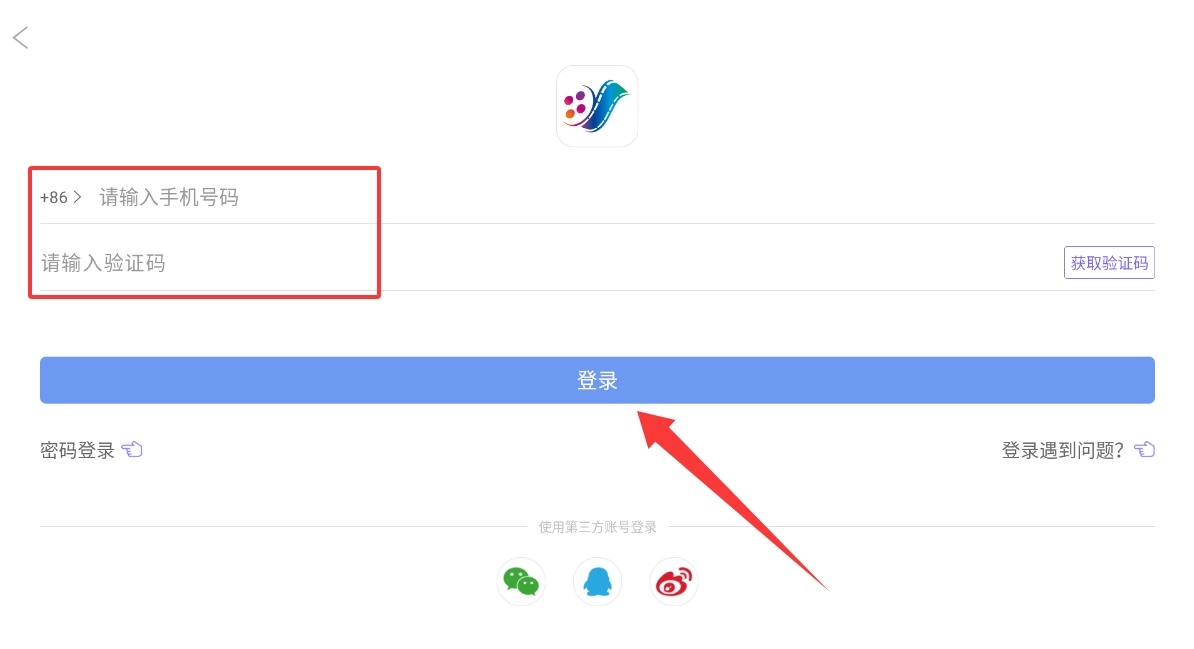 2、进入账号登录窗口,填写手机号获取动态密码登入,或直接选用第三方社交账号快速绑定。