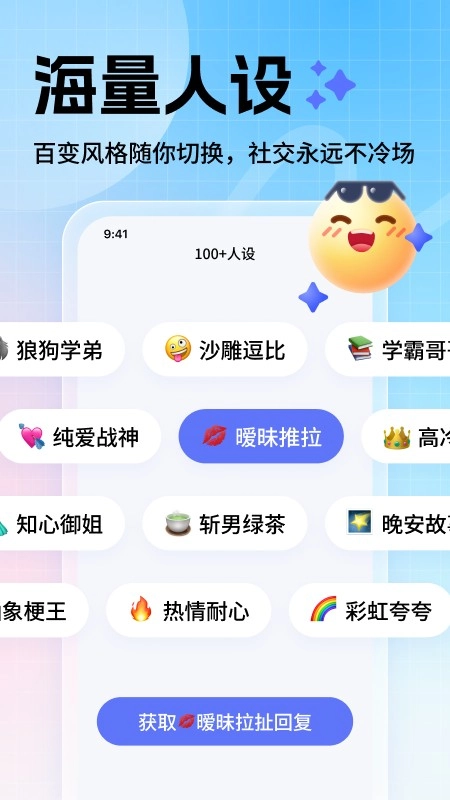 2、拥有多样化表达风格库,其中包含职场专业、朋友闲聊、恋爱甜蜜等超十种沟通模式。能依据不同社交场景实现智能切换,确保每一句话都契合当下场景,做到恰到好处。